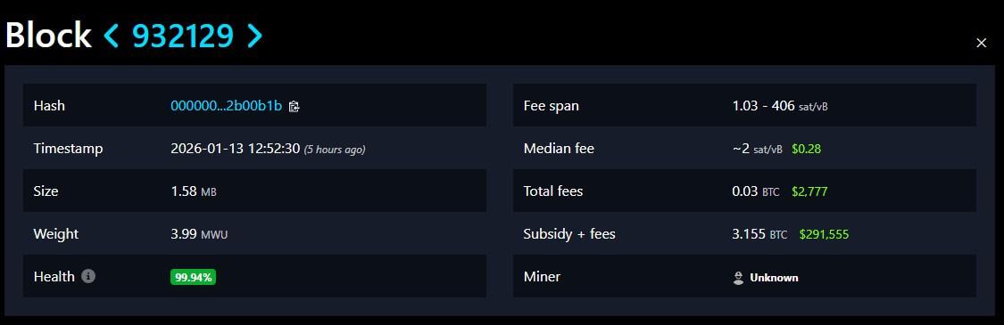 A single Bitcoin (BTC) miner collected a full block reward on Jan. 13, claiming 3.125…