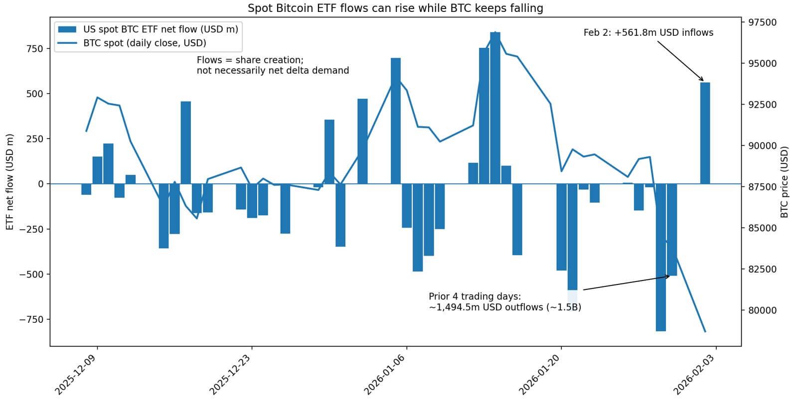 Posted inTrading Bitcoin has ended its $1.5B outflow streak, yet the trade driving inflows could vanish under pressure US spot Bitcoin exchange-traded funds recorded $561.8 million in net inflows on Feb. 2, ending… February 4, 2026